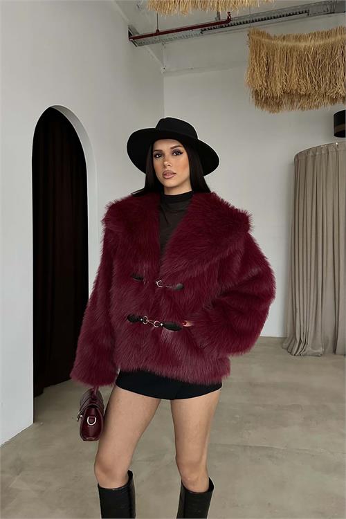 Bordo Astarlı Cepli Deri Bağlama Aksesuarlı Kürk Ceket HSZ022