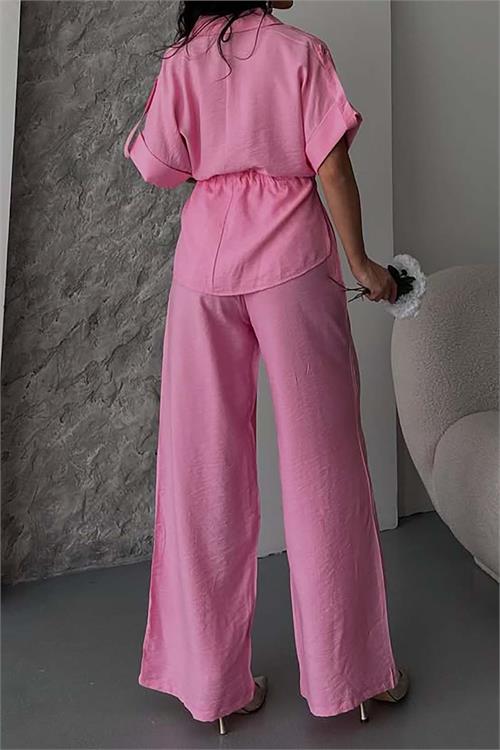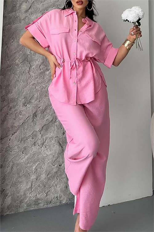 Kadın Pembe Bağlama Detaylı Apoletli Keten Gömlek Pantolon Takım HSZ057