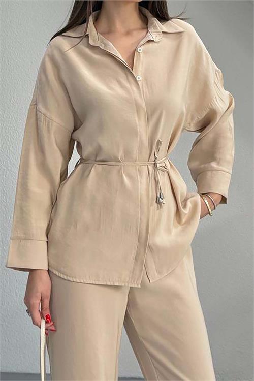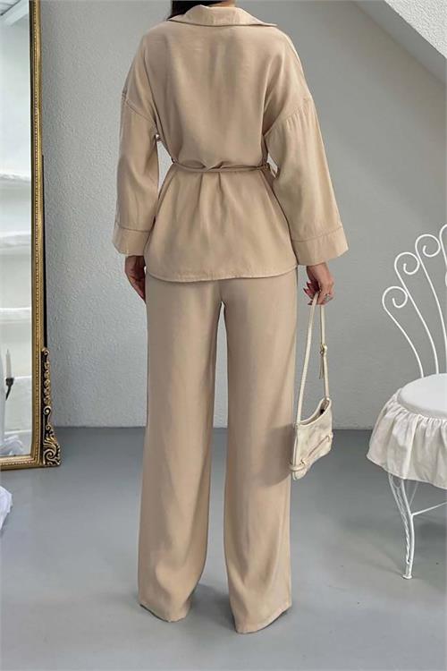 Kadın Bej Bel Bağlamalı Gömlek Pantolon Takım Cepli Lastikli HSZ041