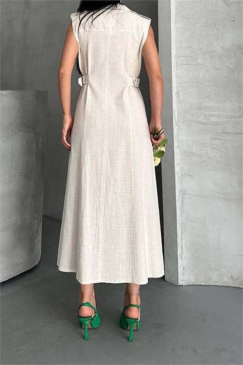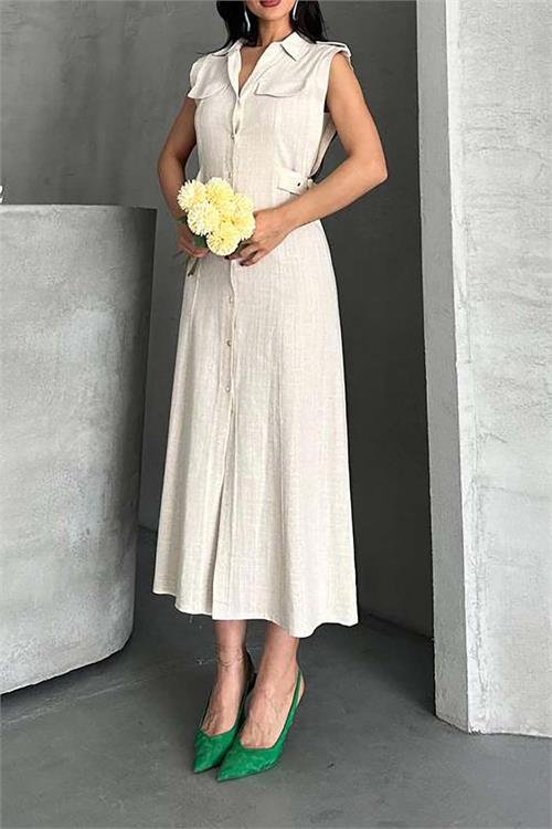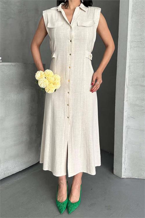 Kadın Bej Keten Kumaş Apoletli Düğmeli Midi Elbise HSZ051