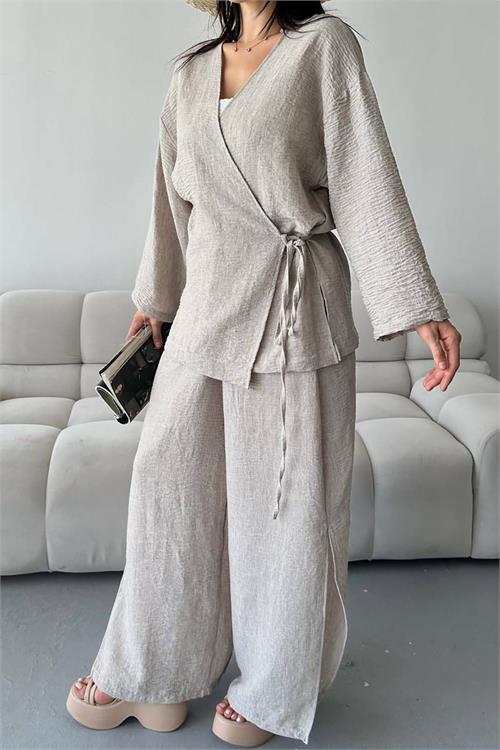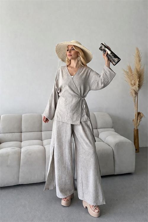 Doğal ve modern tasarımıyla öne çıkan bu keten ikili takım, rahat kesimi ve akıcı dokusuyla gün boyu konfor sunar.