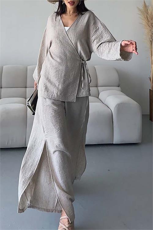 Yandan bağlamalı ve yırtmaç detaylı üst tasarımı sayesinde hareketli ve zarif bir görünüm oluşturur. Lastikli bel ve cepli pantolon formu ise hem rahatlık hem kullanım kolaylığı sağlar.