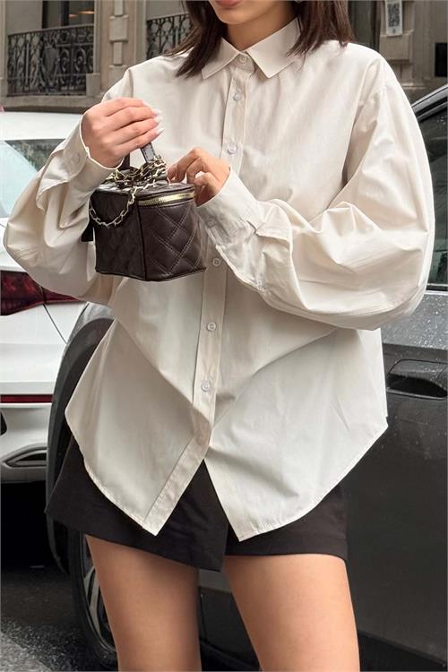 Kadın Bej Oversize Gömlek Düğmeli Uzun Kollu Şık Kesim HSZ059