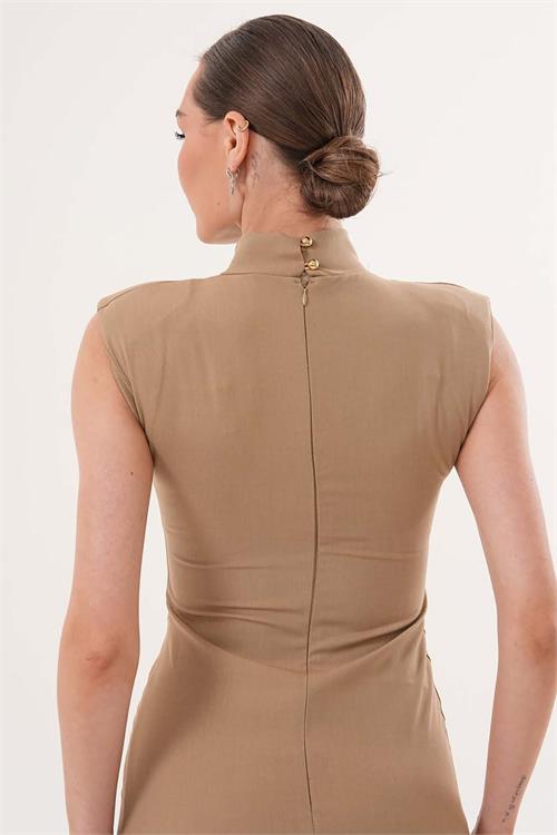 Dik yaka formu, arka sırt fermuar kapaması ve gold ense düğme detayı ile bütünsel olarak premium bir görünüm sunar. Günlük şıklıkta ve özel kombinlerde rahatlıkla tercih edilebilir.