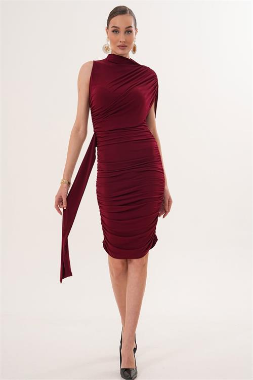 Kadın Bordo Drapeli Kuyruk Detaylı Tek Omuz Sandy Kumaş Elbise HSZ069