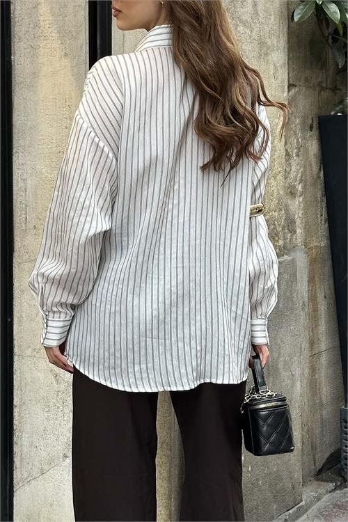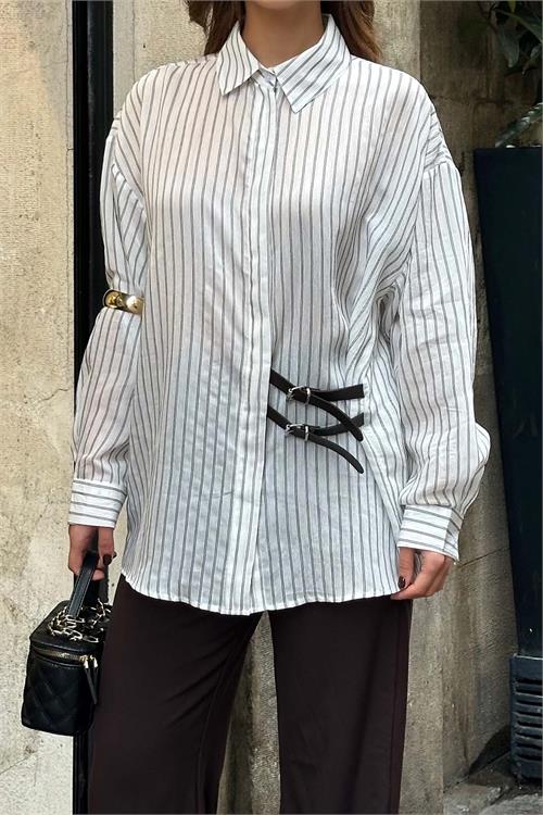 Kadın Ekru Çizgili Oversize Düğmeli Yan Deri Bağlama Gömlek HSZ056