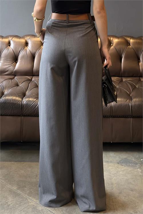 Kadın Gri Modal Kumaş Yüksek Bel Kemer Detaylı Bol Paça Pantolon HSZ060