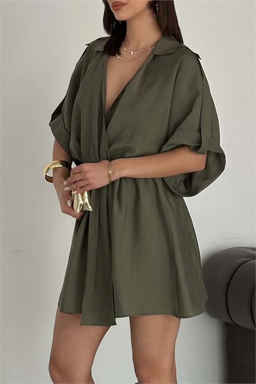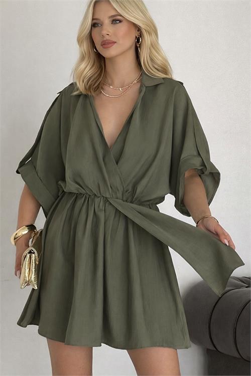 Kadın Haki Modal Kumaş V Yaka Belden Büzgülü Apolet Detaylı Mini Elbise HSZ054