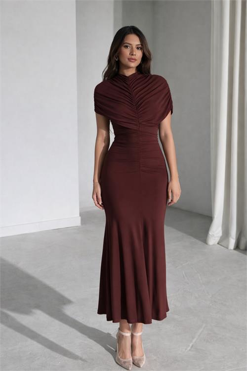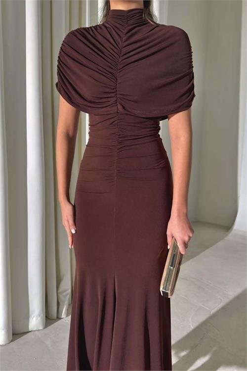 Yüksek yaka ve omuzdan bele uzanan büzgü detayları, silueti daha ince ve dengeli gösterir. Özel davetler, gece organizasyonları ve şık kombinler için ideal bir tercih sunar. Hem sade hem etkileyici bir görünüm isteyenler için vazgeçilmez bir parçadır.