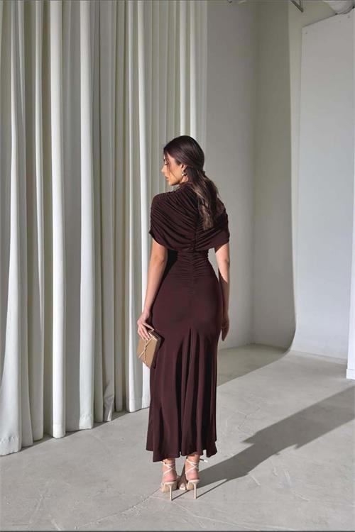 Vücut hatlarını kusursuz şekilde ortaya çıkaran bu büzgü detaylı uzun elbise, güçlü ve iddialı bir stil sunar. Örme sandy kumaşın esnek ve toparlayıcı yapısı sayesinde gün boyu konfor sağlarken, akışkan formu ile zarif bir duruş kazandırır.