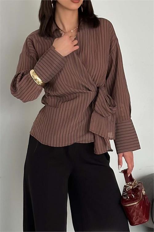 Kadın Kahverengi Çizgili Kruvaze Yandan Bağlamalı Gömlek HSZ055