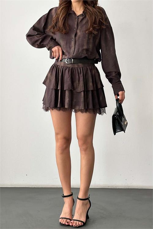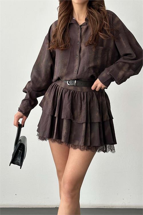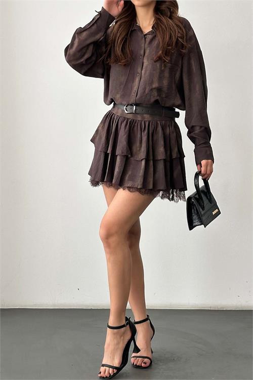 Kadın Kahverengi desenli Etek Gömlek Takım Kemer Aksesuarlı HSZ040