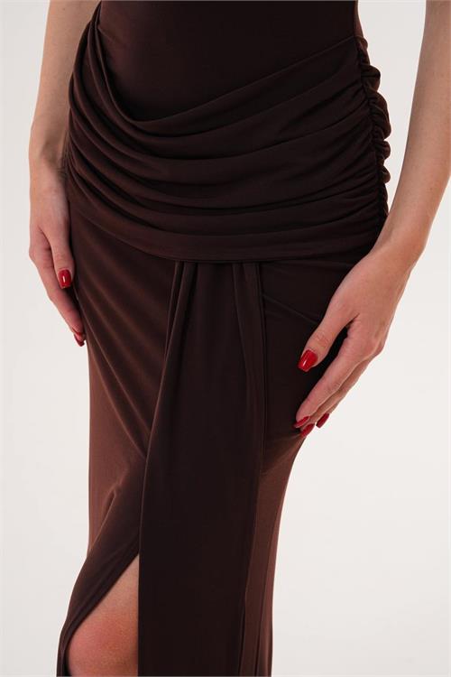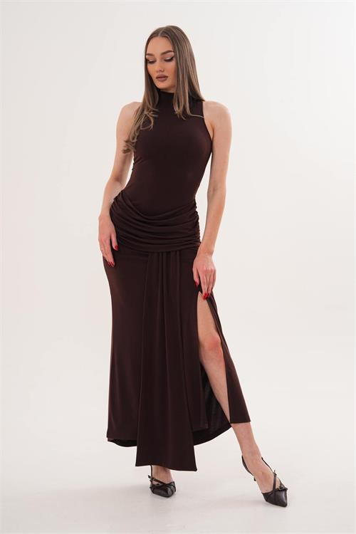 Kadın Kahverengi Drapeli Kuyruk Detaylı Yüksek Yaka Uzun Sandy Kumaş Elbise HSZ067