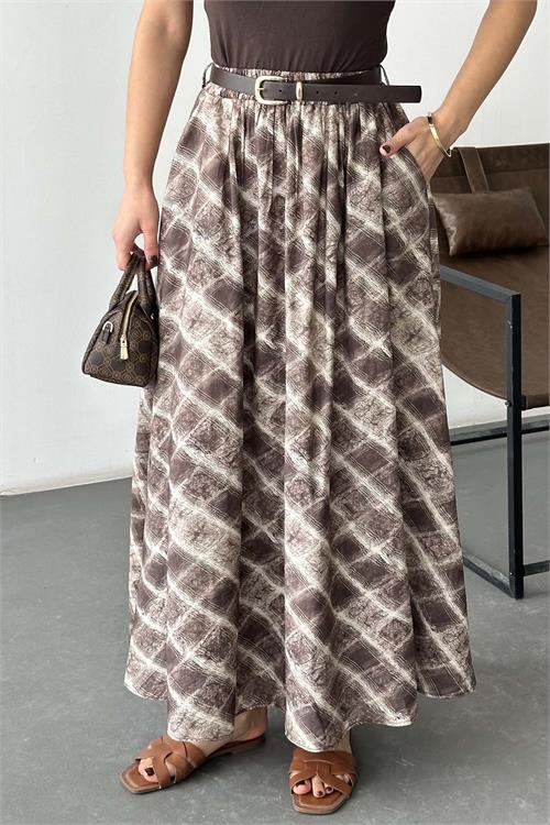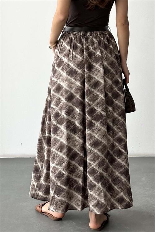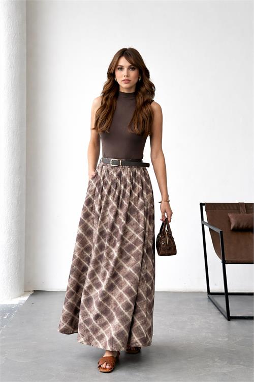 Modern ve akıcı formu ile öne çıkan uzun etek, hem rahat hem de şık bir görünüm sunar.Kare Desenli kumaşı sayesinde dikkat çekici bir stil oluştururken kemerli tasarımı bel hattını vurgulayarak dengeli bir duruş sağlar.