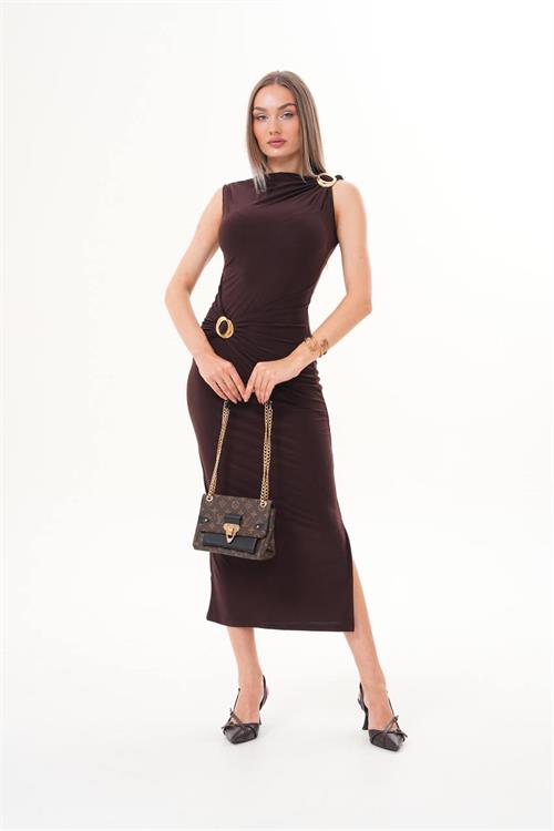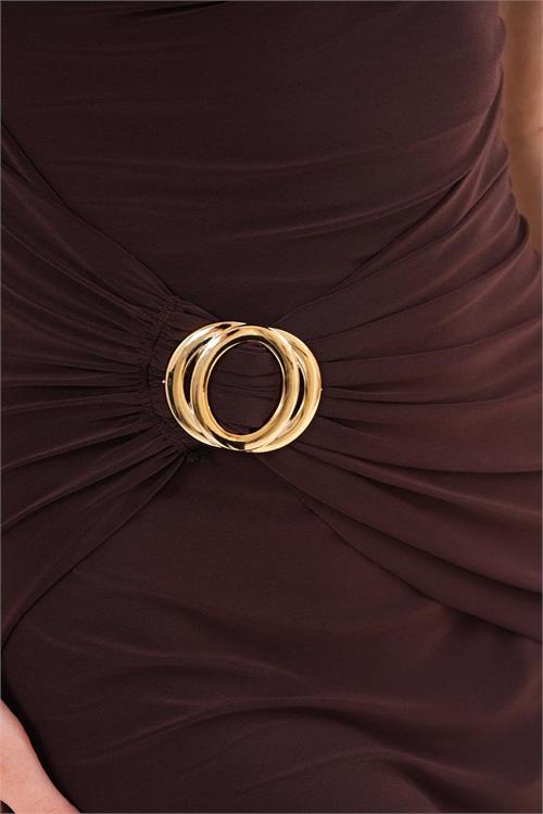 Omuz ve ön kısmında yer alan gold toka aksesuar detayı elbiseye sofistike ve dikkat çekici bir hava katarken, drapeli formu vücut hatlarını daha dengeli ve estetik gösterir. Minimal çizgilerle zenginleştirilmiş tasarımı sayesinde özel davetlerde ve gece kombinlerinde iddialı bir görünüm sunar.