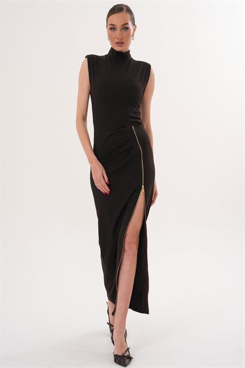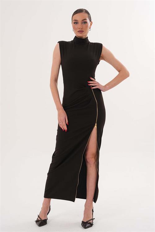 Kadın Kahverengi Poli Viskon Kumaş Fermuar Detaylı Yırtmaçlı Dik Yaka Uzun Elbise HSZ071