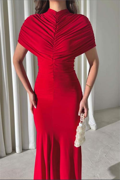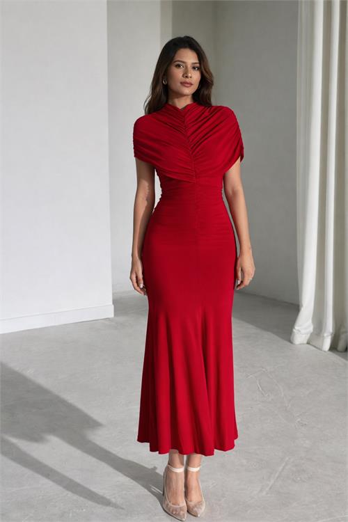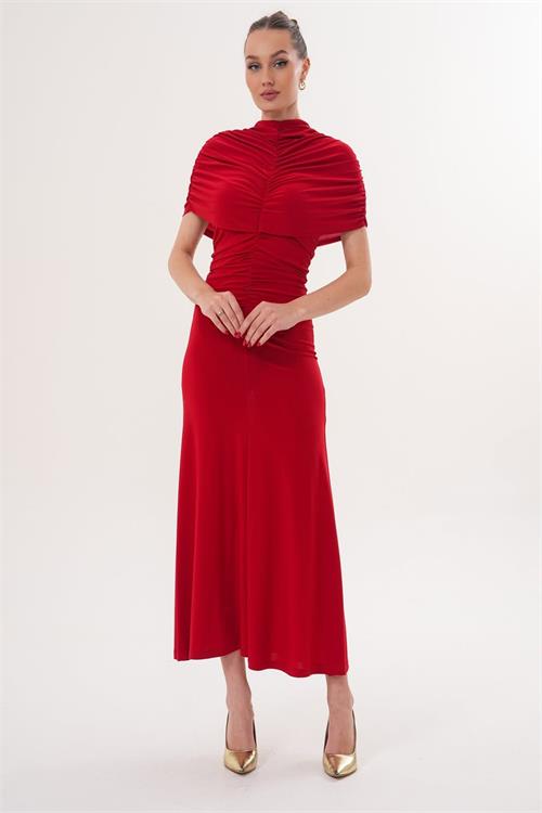 Kadın Kırmızı Büzgü Detaylı Yüksek Yaka Uzun Sandy Kumaş Elbise HSZ066