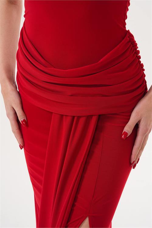 Kadın Kırmızı Drapeli Kuyruk Detaylı Yüksek Yaka Uzun Sandy Kumaş Elbise HSZ067