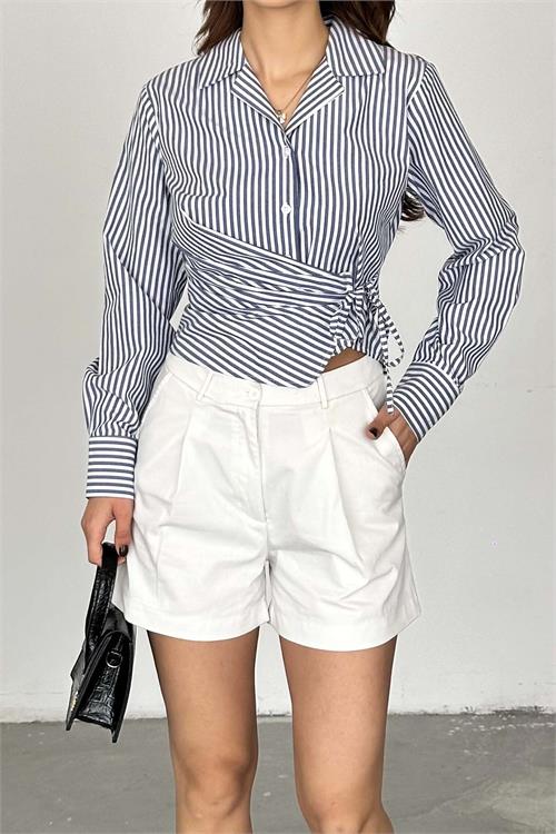 Modern ve zarif tasarımıyla öne çıkan çizgili bağlama detaylı crop gömlek, stil sahibi kombinlerin vazgeçilmez parçalarından biridir. Ön kısmındaki bağlama detayı sayesinde vücuda uyum sağlayan şık bir görünüm sunar. Çizgili deseni klasik gömlek stiline modern bir dokunuş katarken jean, etek veya şort kombinleriyle rahatlıkla kullanılabilir.