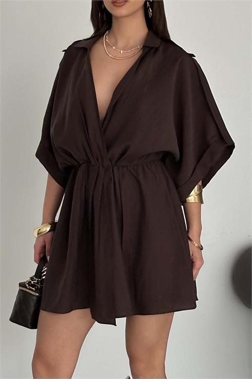 Belden büzgülü yapısı sayesinde vücut hatlarını dengeli şekilde sararken, V yaka formu feminen bir görünüm kazandırır. Apolet detaylı kolları ile modern ve dikkat çekici bir duruş sağlar.