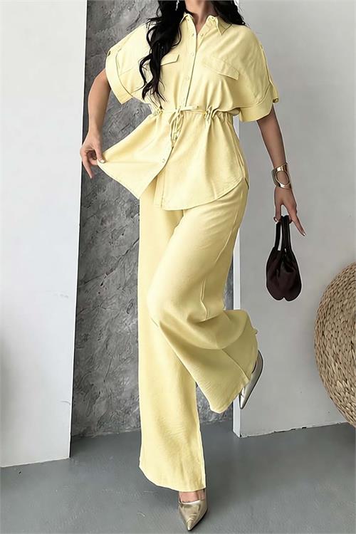 Doğal dokusu ve hafif yapısıyla öne çıkan keten takım, yaz aylarında ferah ve konforlu bir kullanım sunar. Üst parçada yer alan bağlama detayı bele form kazandırarak daha dengeli ve şık bir siluet oluşturur.