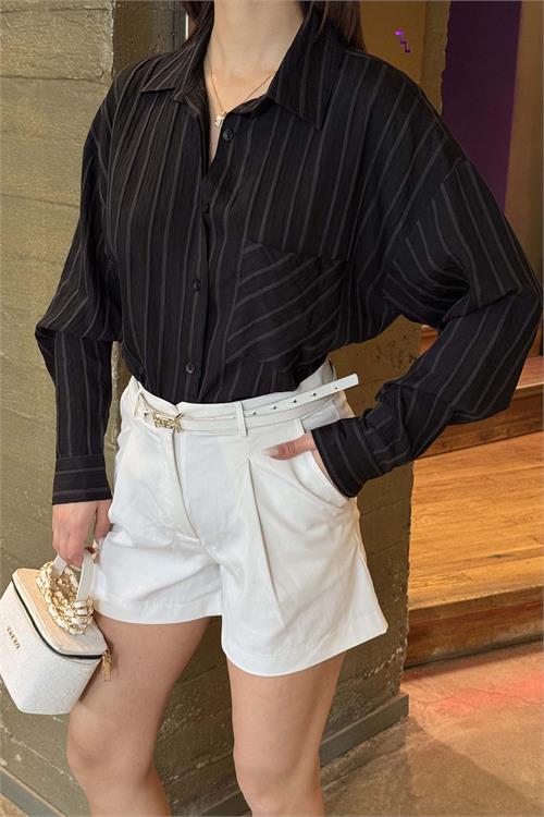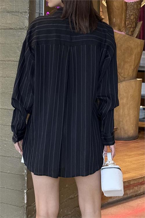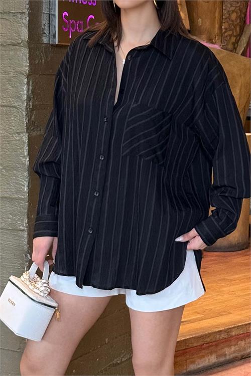 Kadın Siyah Çizgili Oversize Gömlek Düğmeli Cepli Uzun Kollu HSZ062