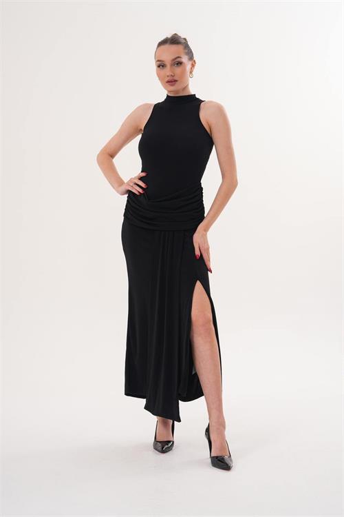 Bel kısmındaki drape detayları vücut hatlarını dengelerken, etek kısmındaki kuyruk detayı elbiseye hareket ve zarafet katar. Yüksek yaka tasarımı ile modern ve güçlü bir stil sunar. Özel davetler ve şık kombinler için ideal bir tercihtir.