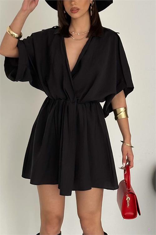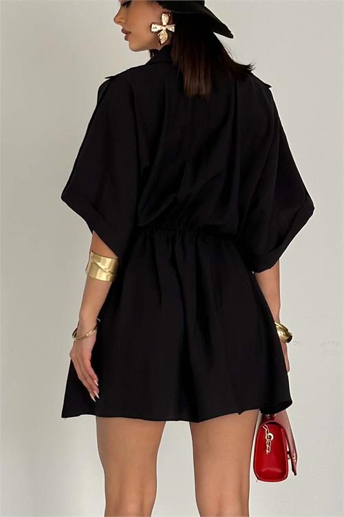 Kadın Siyah Modal Kumaş V Yaka Belden Büzgülü Apolet Detaylı Mini Elbise HSZ054