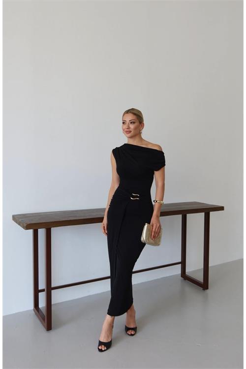 Kadın Siyah Örme Sandy Kumaş Likralı Esnek Drapeli Aksesuar Detaylı Midi Elbise HSZ072