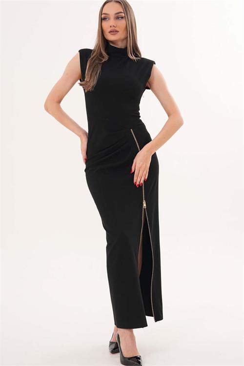 Poli viskon kumaşı sayesinde akıcı ve konforlu bir kullanım sunarken, vücuda oturan formu ile zarif bir duruş sağlar. Etek kısmındaki büzgü detayı ürüne hareket kazandırırken, fermuarlı yırtmaç tasarımı şıklığı bir üst seviyeye taşır.