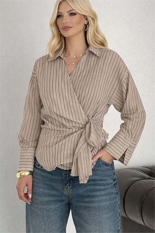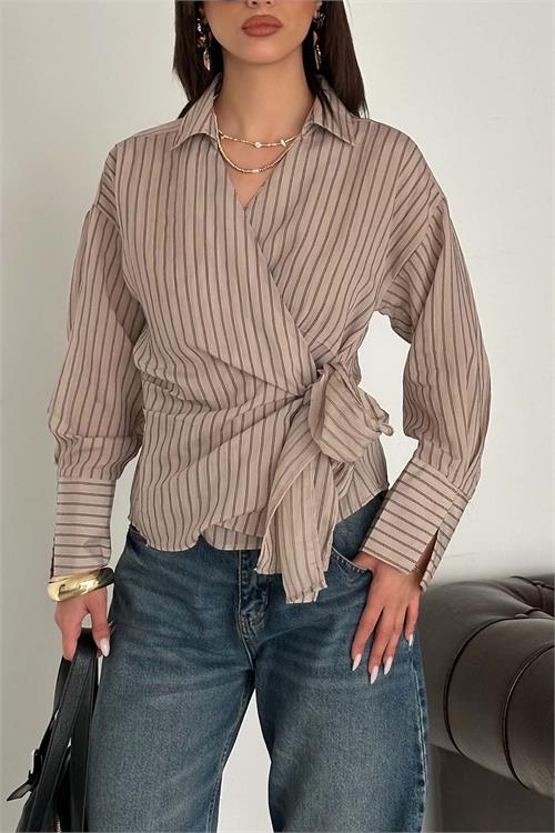 Kadın Vizon Çizgili Kruvaze Yandan Bağlamalı Gömlek HSZ055