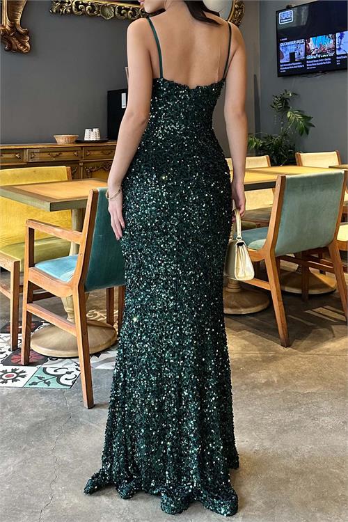 Göz alıcı işıltıya sahip bu pul payet abiye elbise, vucudu saran kesimi ile zarif ve feminen bir siluet sunar. Askılı tasarimi modern bir gorunum kazandirirken, balik formu sayesinde sik ve iddiali bir durus saglar.