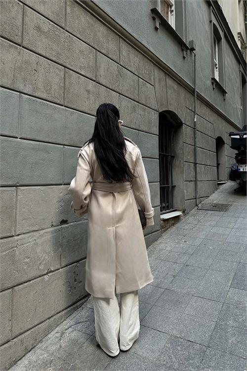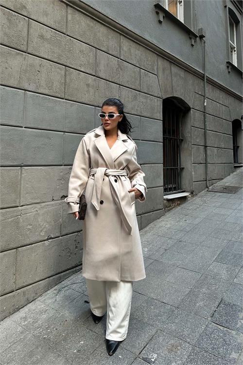 Kadın Bej Kuşaklı Kruvaze Yaka Uzun Kaşe Kaban HSZ001
