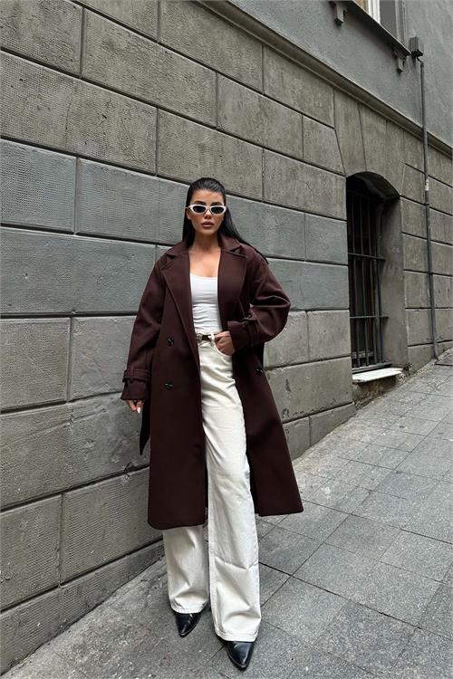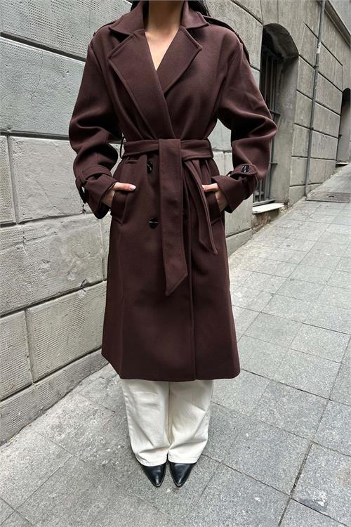 Kadın Kahve Kuşaklı Kruvaze Yaka Uzun Kaşe Kaban HSZ001