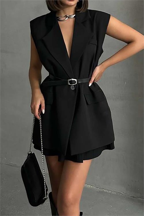 Kadın Siyah Kemerli Kolsuz Blazer Yelek – Kruvaze Yaka, Cepli, Şık Tasarım