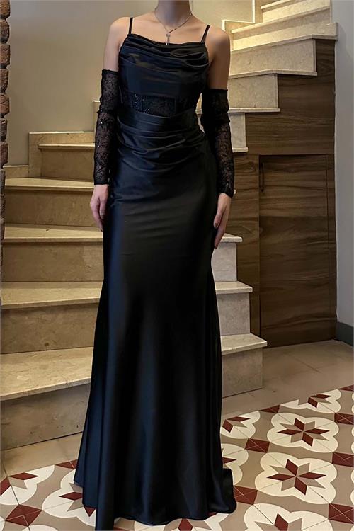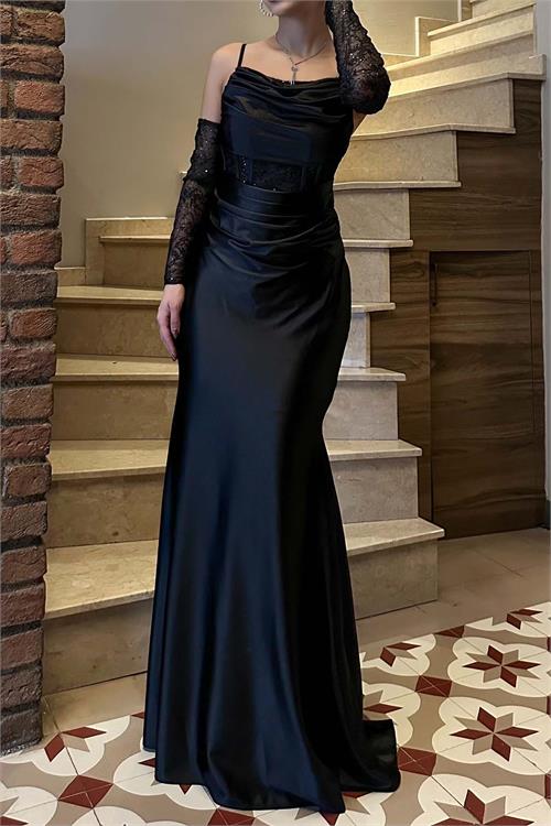 Zarif ve etkileyici bir siluet sunan bu saten abiye elbise, vucudu saran formu ile feminen bir durus kazandirir. Eldiven detayli kol tasarimi elbiseye sofistike ve dikkat cekici bir hava katar.