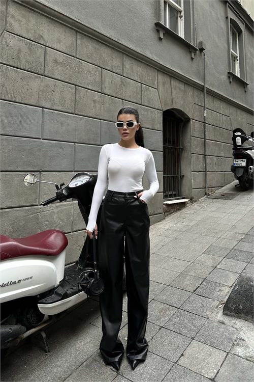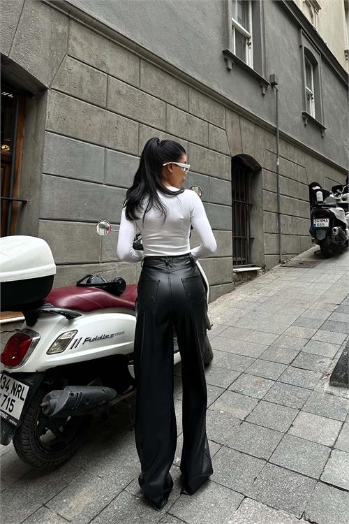 Şıklığı ve konforu bir arada sunan kadın siyah yüksek bel bol paça deri pantolon, modern kesimi ve likralı yapısıyla gün boyu rahat kullanım sağlar. Yüksek bel formu vücudu toparlarken, bol paça kesimi zarif ve trend bir siluet oluşturur.