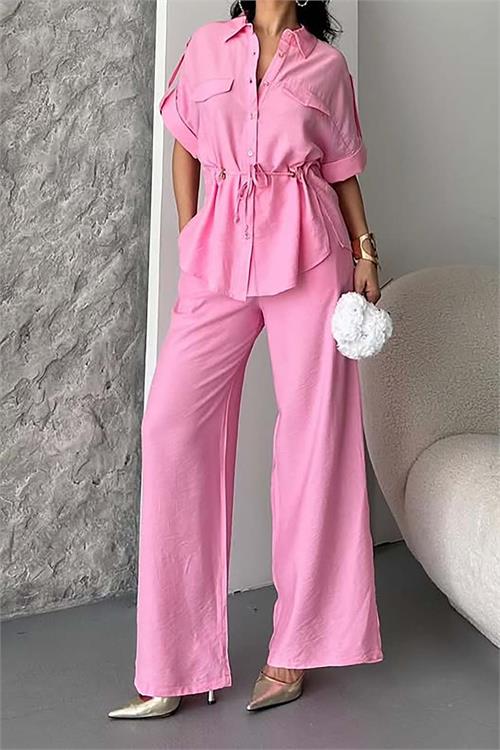 Kadın Pembe Bağlama Detaylı Apoletli Keten Gömlek Pantolon Takım HSZ057
