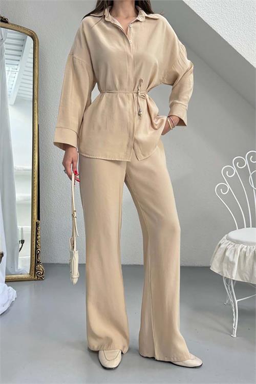 Kadın Bej Bel Bağlamalı Gömlek Pantolon Takım Cepli Lastikli HSZ041