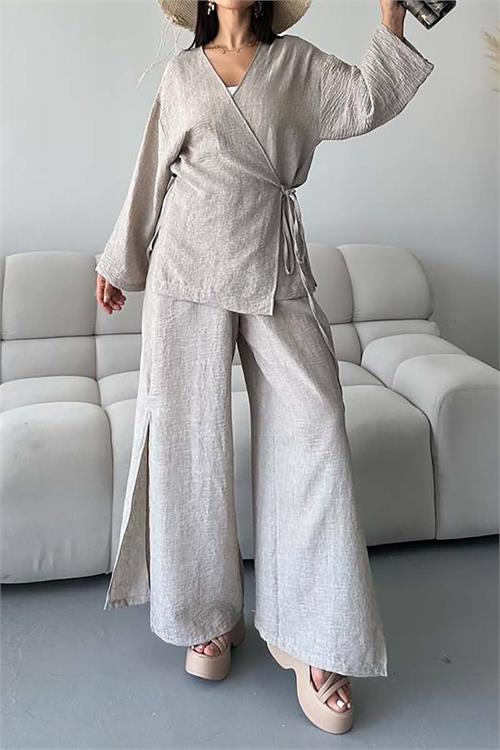 Yandan bağlamalı ve yırtmaç detaylı üst tasarımı sayesinde hareketli ve zarif bir görünüm oluşturur. Lastikli bel ve cepli pantolon formu ise hem rahatlık hem kullanım kolaylığı sağlar.
