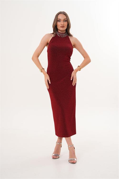 Yüksek yaka kısmındaki taş detaylar elbiseye ışıltı katarken, midi boy kesimi ile modern ve dengeli bir görünüm sunar. Günlük şık kombinlerden özel davetlere kadar geniş kullanım alanına sahiptir.