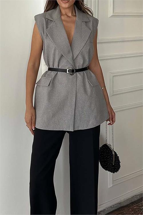 Modern ve güçlü bir stil sunan kolsuz blazer yelek modeli, kruvaze yaka detayı ve kemerli formuyla feminen bir siluet oluşturur.