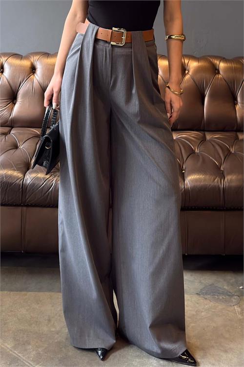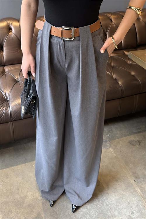 Kadın Gri Modal Kumaş Yüksek Bel Kemer Detaylı Bol Paça Pantolon HSZ060