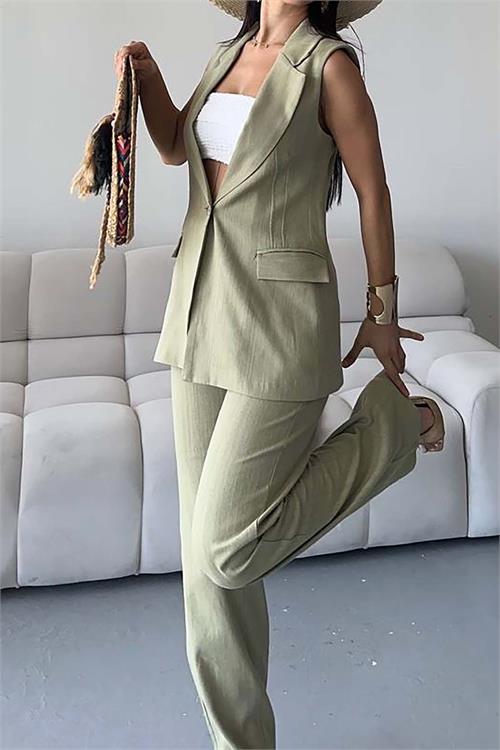 Blazer kesim yelek ve dökümlü pantolon formu sayesinde hem güçlü hem rahat bir görünüm sunar. Günlük kombinlerden özel davet stiline kadar geniş kullanım alanı sağlar.