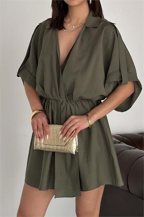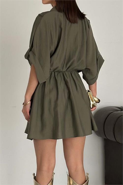 Kadın Haki Modal Kumaş V Yaka Belden Büzgülü Apolet Detaylı Mini Elbise HSZ054