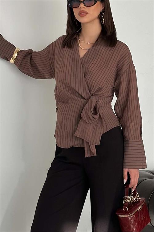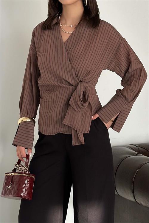 Kadın Kahverengi Çizgili Kruvaze Yandan Bağlamalı Gömlek HSZ055
