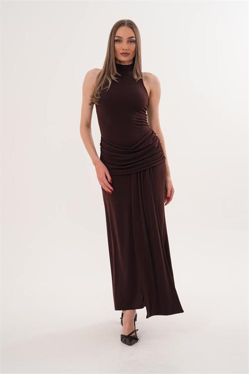 Kadın Kahverengi Drapeli Kuyruk Detaylı Yüksek Yaka Uzun Sandy Kumaş Elbise HSZ067