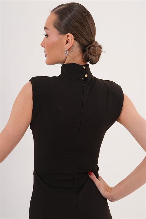 Kadın Kahverengi Poli Viskon Kumaş Fermuar Detaylı Yırtmaçlı Dik Yaka Uzun Elbise HSZ071