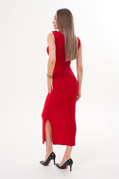 Kadın kırmızı Omuz ve Ön Gold Toka Aksesuarlı Drapeli Sandy Kumaş Midi Elbise HSZ070