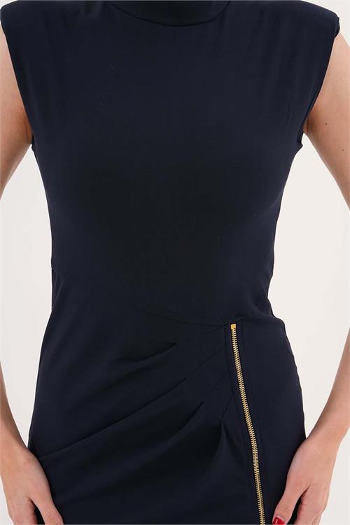 Kadın Lacivert Poli Viskon Kumaş Fermuar Detaylı Yırtmaçlı Dik Yaka Uzun Elbise HSZ071